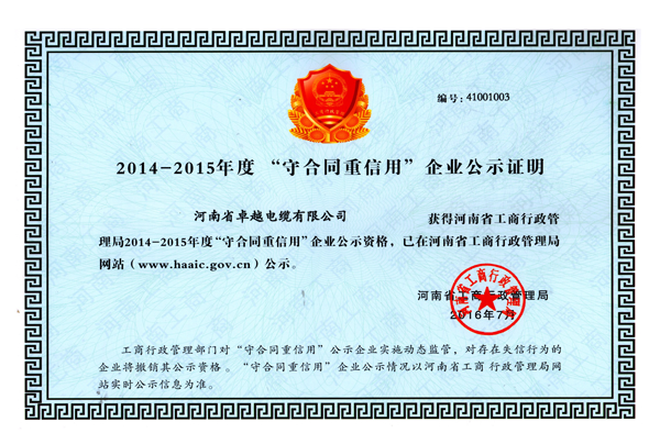 祝賀河南省卓越電纜有限公司成為**“守合同 重信用企業”